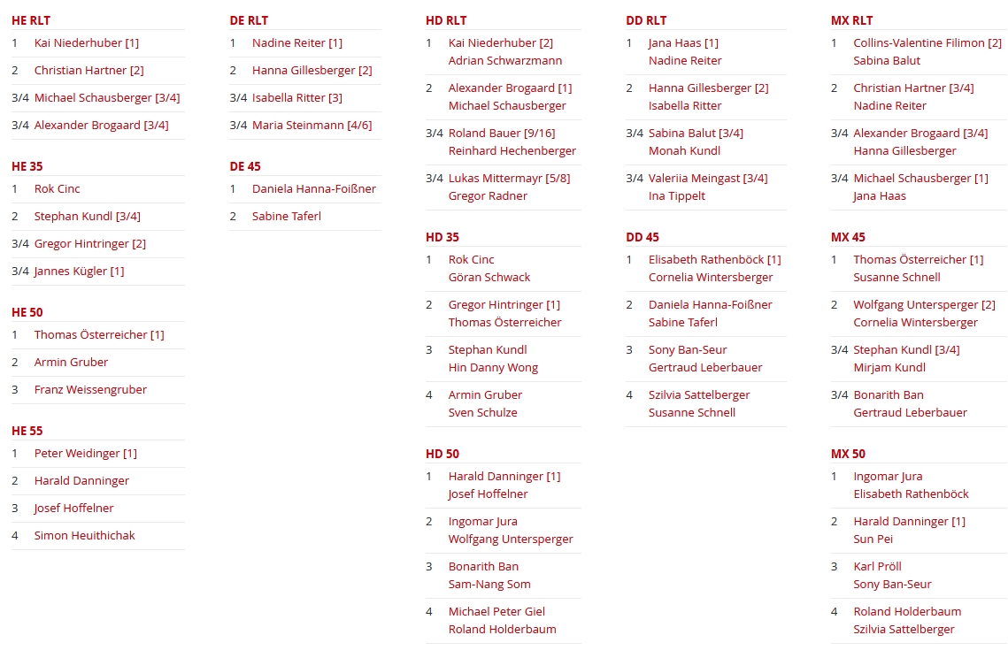 Die Landesmeisterschaft wurde top organisiert von der Sportunion Braunau, vor allem das tolle Abendessen beim Players Dinner wird lange in Erinnerung bleiben. Nach zwei starken Turniertagen wurden die Gewinner der folgenden Bewerbe ermittelt: